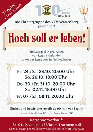 Im Oktober und November zeigt die Theatergruppe des VTV Wartenberg die Komödie Hoch soll er leben von Regina Harlander und ich darf wieder Regie führen. Schaut vorbei, das wird 'ne Party!