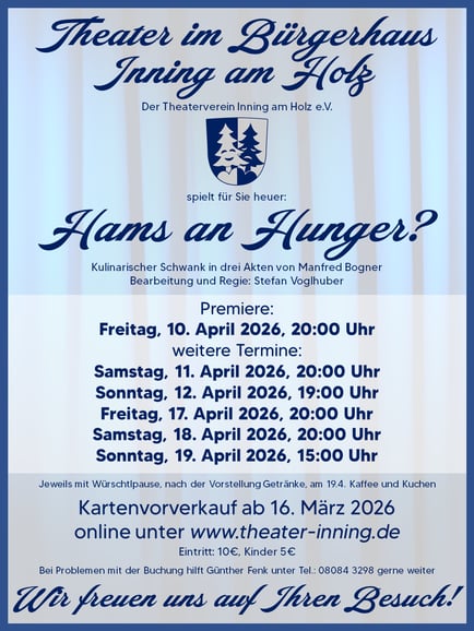 Der Theaterverein Inning am Holz e.V. zeigt im April die Komödie Hams an Hunger? von Manfred Bogner unter meiner Regie.
